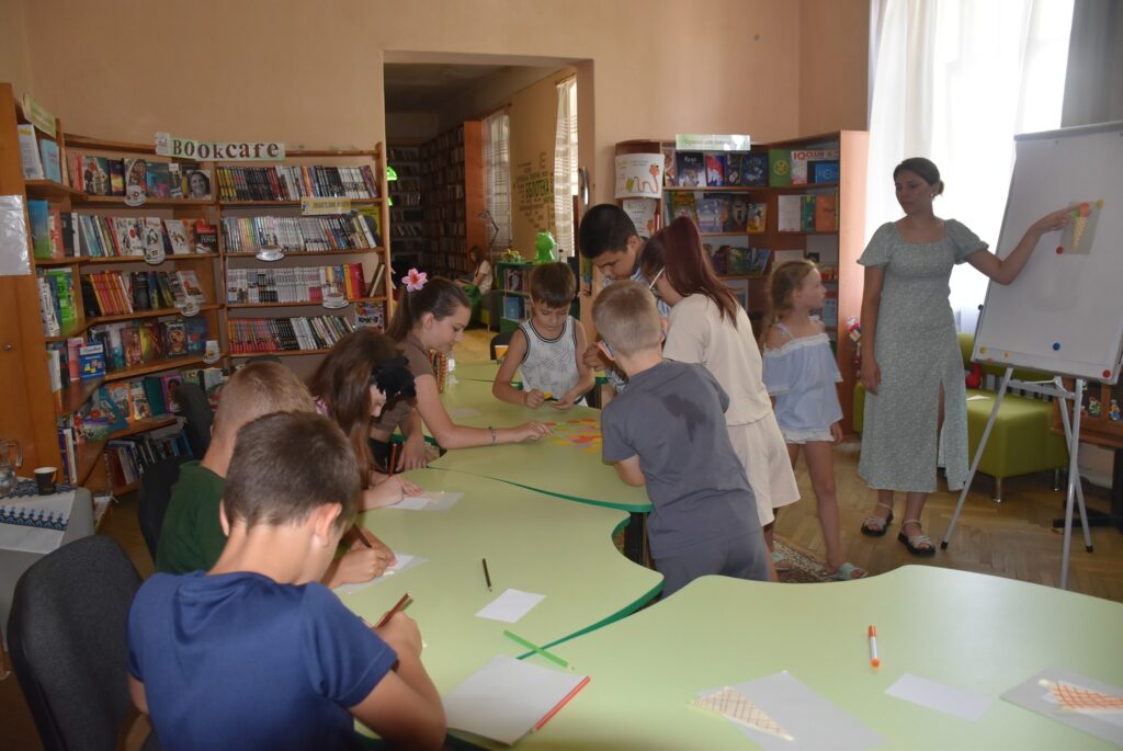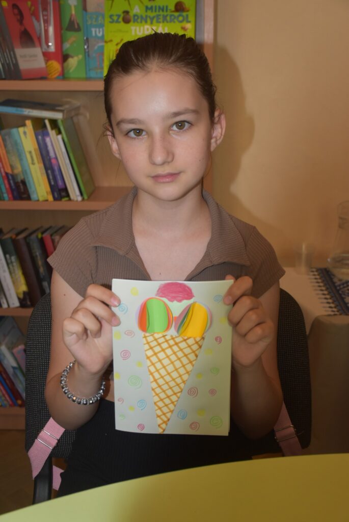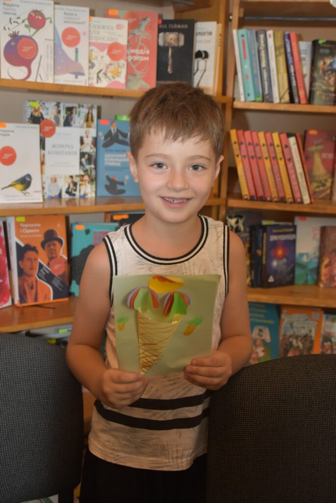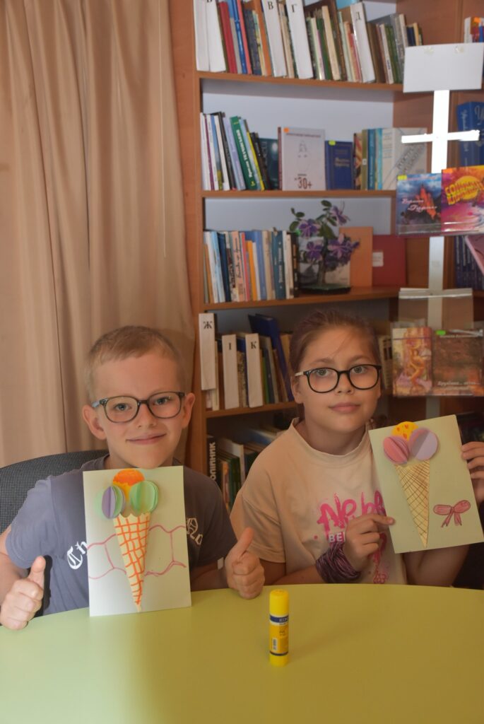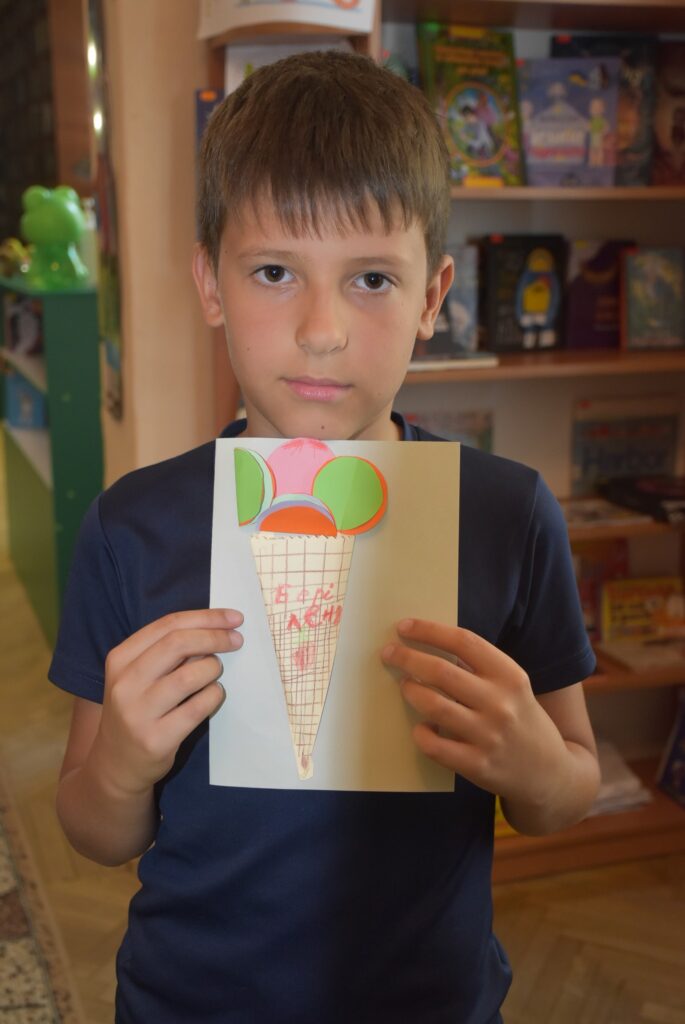Наступним етапом став майстер-клас із виготовлення об’ємної фігури морозива з рецептом – кожна дитина створила свою унікальну апетитну порцію з кольорового паперу, додаючи до неї власну “родзинку”.