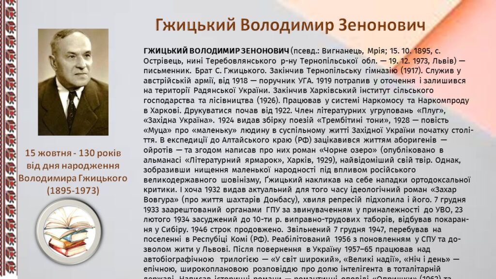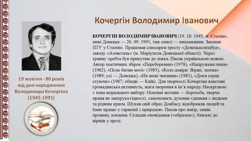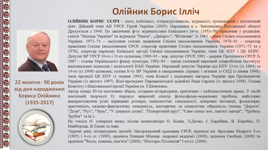 Виноградівська центральна публічна бібліотека продовжує віртуальну рубрику про українських письменників-ювілярів у оновленому виданні «Майстри українського письменства» (українські письменники-ювіляри 2025 року, які відзначаються на державному рівні, визначені постановою Верховної Ради України «Про відзначення пам’ятних дат і ювілеїв у 2024-2025 роках»)