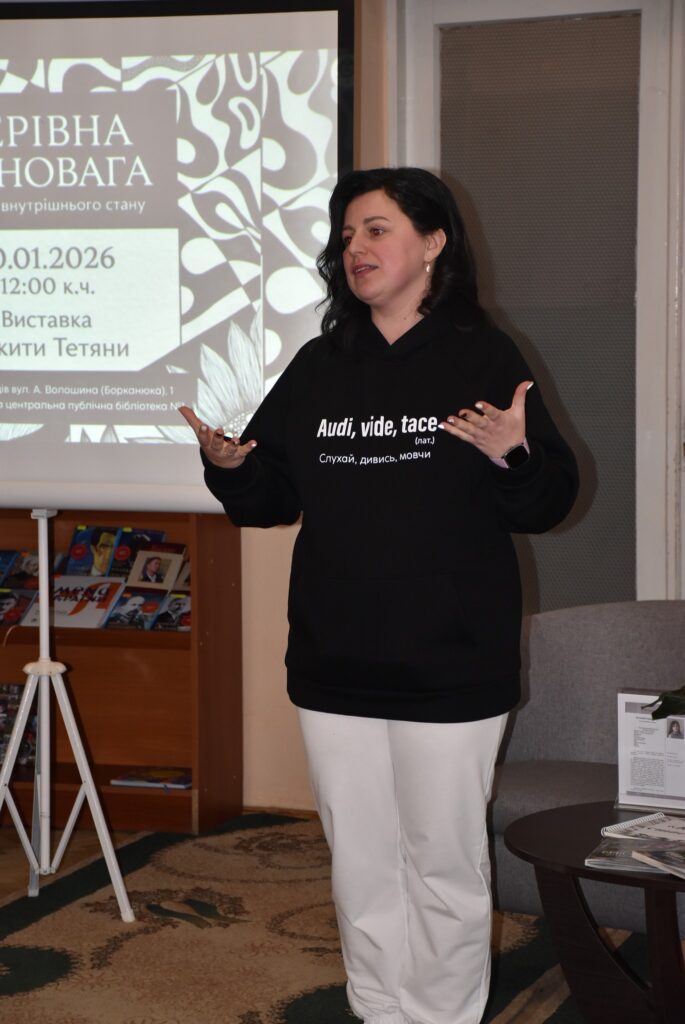 Під час зустрічі Тетяна Микита поділилася історією свого творчого шляху, розповіла що означає серія чорно-білої графіки, який стан вона передає та майбутні плани, зокрема ідею видання власної книги.