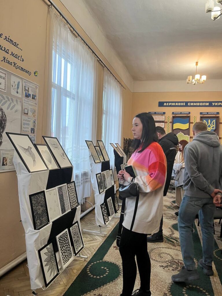 На виставці було представлено понад 40 робіт чорно-білої графіки, у яких через лінії, ритми й тіні авторка передає глибокі переживання та роздуми. Атмосферу події доповнили щирі відео-вітання від учасників лялькового театру та книжкового клубу «Ноти слів», які словами підтримки засвідчили свою повагу й захоплення творчістю пані Тетяни.